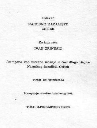 1) Primjeti� li; iako na zgradi pi�e HRVATSKO NARODNO KAZALI�TE, te nesretne 1967. godine je kao izdava� knjige napisano Narodno kazali�te u Osijeku. Rije� HRVATSKO tada su zabranili upotrebljavati i, ako se dobro sje�am, ta rije� je bila odstranjena s fasade kazali�ta, ali se trag slova jasno vidio. Sre�om je netko uspio sakriti i sa�uvati ta slova, pa su ih kasnije, u boljim vremenima, ponovo montirali na fasadu kazali�ta. Srda�ni pozdrav Zvonimir.
