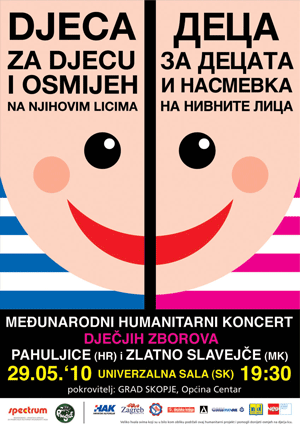 Projekt „Djeca za djecu i njihov osmjeh na licu”, realizirao se 29.svibnja humanitarnim koncertom u koncertnoj dvorani „Univerzalna sala” u Skopju. Na koncertu zbor „Pahuljice” je nastupio jednim dijelom samostalno, a drugim dijelom s dje�jim zborom „Zlatno slavej�e” iz Skopja. Dje�ji zbor „Pahuljice” iz Novog Zagreba, istoimene Udruge Pahuljice, djeluju s velikim uspjehom ve� 24 godine. Za svoje uspjehe i brojne nastupe u Hrvatskoj i inozemstvu (Austrija, Njema�ka, Slovenija) su više puta nagra�ivani, a za svoju 20 godišnjicu rada nagra�eni su velikom plaketom Grada Zagreba.