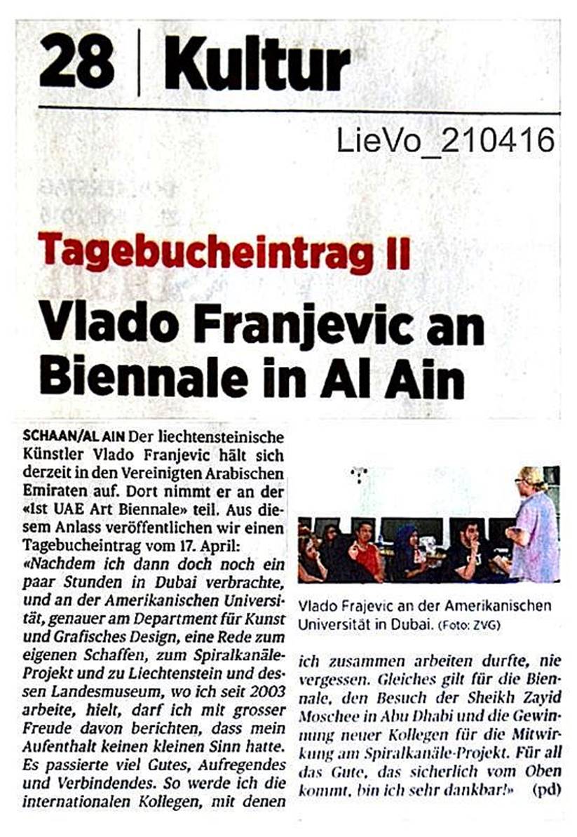 Ekskluzivno za portal arhiva.croatia.ch izvještava Vlado Franjevi�, jedini Hrvat i jedini neoficijelni reprezentant Kne�evine Lihtenštajn na prvom umjetni�kom bijenalu Sjedinjenih Arapskih Emirata u Al Ainu od 10.-17.4.2016.