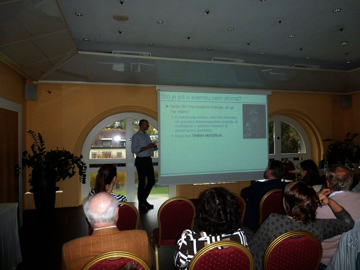 Nakon što se predstavio i objasnio na kakvom je eksperimentu u CERN-u u �enevi aktivno sura�ivao, osim što je prikazao tijek toga zahtjevnog eksperimenta, na kojem su znanstvenici, me�u njima i nekoliko desetaka hrvatskih znanstvenika i doktoranada, radili dvadeset godina i na kojem se i dalje radi, profesor Puljak nam je zorno prikazao i teoriju širenja svemira od Velikog praska do danas, toga beskona�nog prostora koji nas okru�uje i koji sadr�i milijarde galaksija, zvijezda i planeta, ali i ogromne prostore tamne materije koju ne mo�emo vidjeti, ali je njeno postojanje dokazano posredno, promatranjem njenog u�inka na vidljive objekte te nam objasnio od �ega se sastoji materija, objasnivši pojmove "Normalne materije", "Tamne materije" i "Tamne energije".