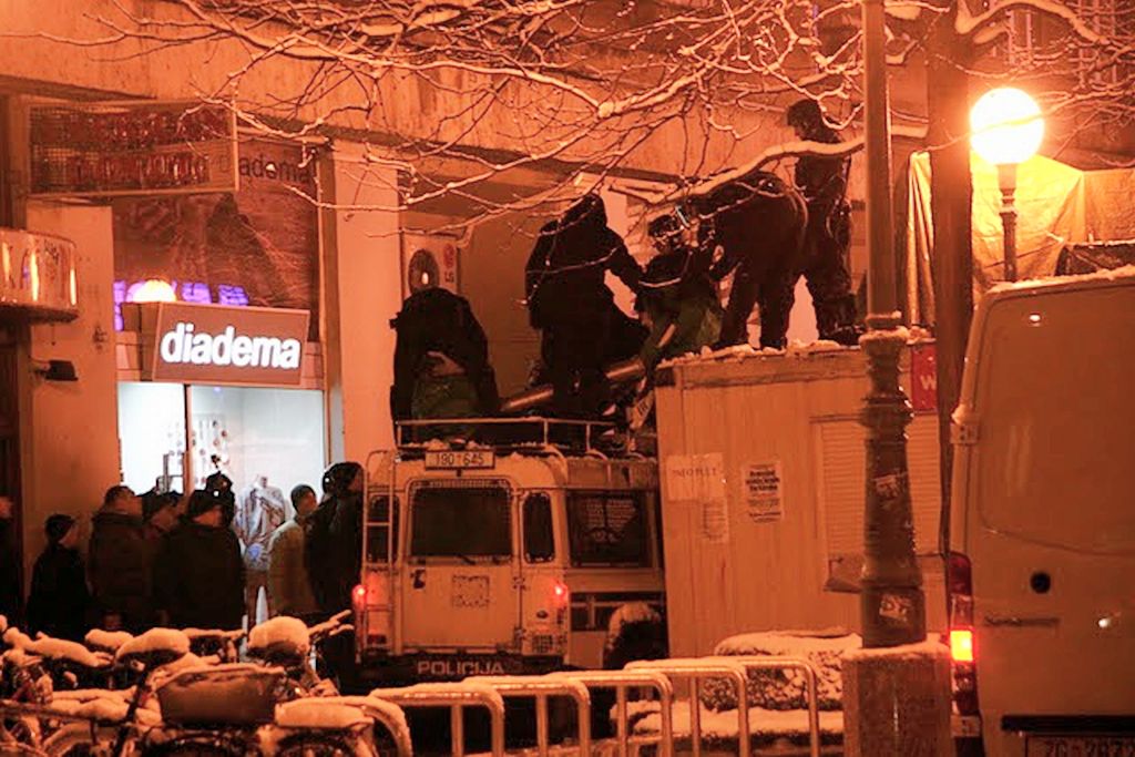 Koordinator udruge Zajednica Humanitas Zoran Oštri� u priop�enju je napisao da se no�as oko 4 sata u Varšavskoj pojavila interventna policija. "Pohapšeni su svi, koji su bili u kontejnerima, de�uraju�i u tom trenutku, �uvaju�i javno dobro od surovih privatnih profiterskih interesa. Prostor je okru�en trakom kao mjesto zlo�ina. Tomislava Tomaševi�a Senfa, predsjednika Zelene akcije, koji je ušao u prostor, zgrabilo je �etvero policajaca i odnijelo. Kip trojanskog konja je razbijen. Kontejneri su ukrcani na kamione. Me�utim, kamioni sada ne mogu napustiti Varšavsku. Oni aktivisti, koji su se na prvi poziv okupili, blokirali su svojim tijelima izlaze iz Varšavske ulice", napisao je Oštri�.