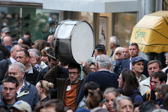 Atmosfera u Varšavskoj uo�i prosvjeda bila je i više nego vesela. Aktivisti su s pozornice koja je postavljena za potrebe prosvjeda puštali glazbu, a Uršu Raukar rasplesala je kultna stvar Boba Dylana "Like a Rolling Stone". Oduševljenje me�u prosvjednicima izazvala je posebna obrada pjesme "Zagreb te zove", u koju su uvršteni stihovi o korupciji u hrvatskoj metropoli, pogodovanju krupnom kapitalu i, naravno, parola "Ne damo Varšavsku!"
