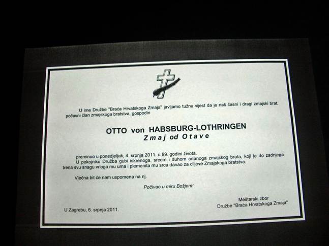 Dru�ba „Bra�a Hrvatskoga Zmaja“ u srijedu 28. rujna odala je po�ast nadvojvodi Ottu von Habsburgu, Zmaju od Otave, sinu posljednjeg hrvatskog kralja bla�enog Karla I. (1916.-1918.), po�asnom predsjedniku Me�unarodne paneuropske unije koji je preminuo 4. srpnja u 99. godini �ivota.